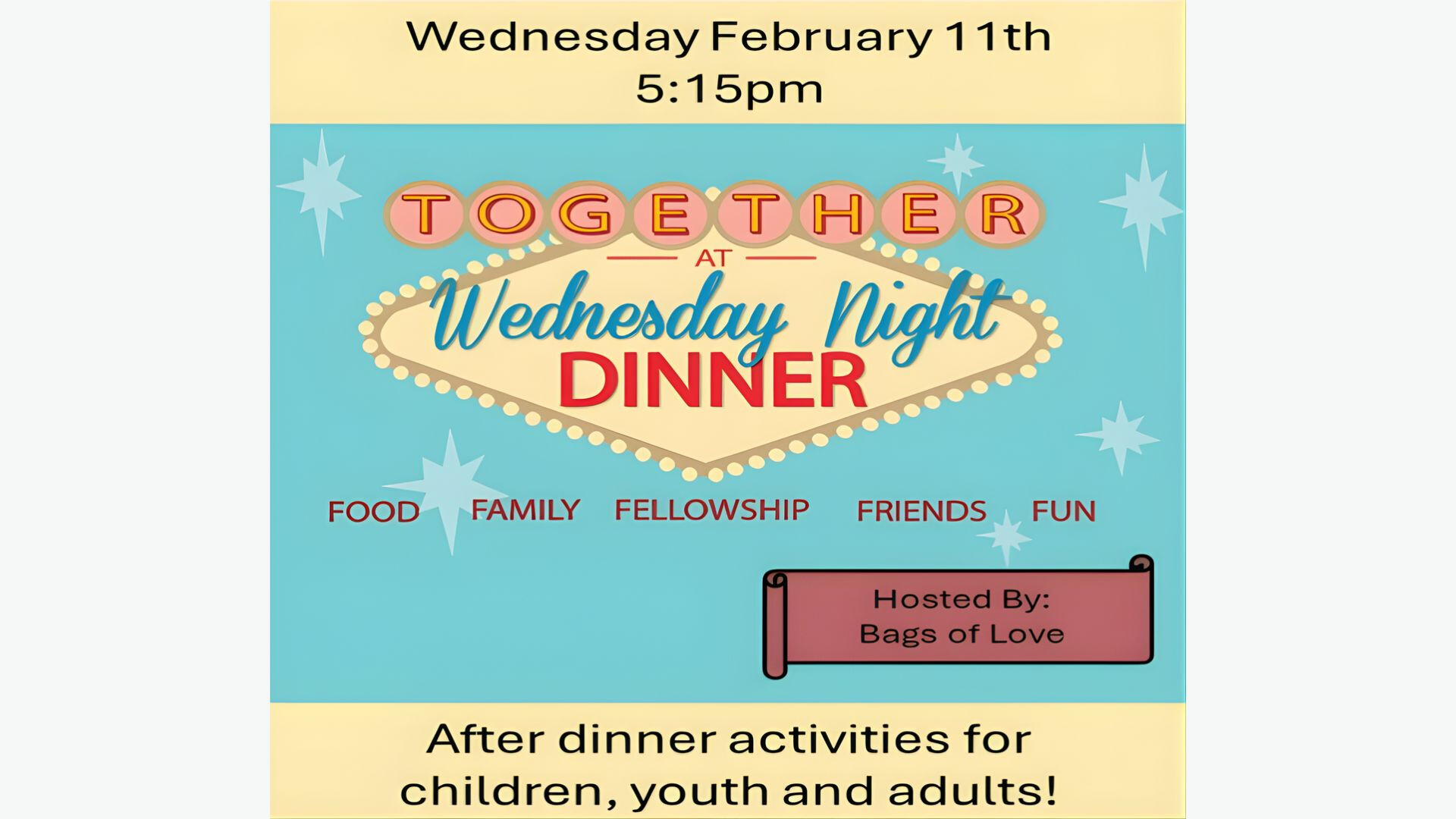 The Wednesday night Church-Wide dinner will be held on February 11th this month. We will be having a wonderful meal hosted by Bags of Love.